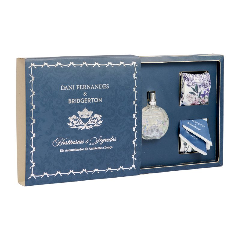 Na collab Dani Fernandes & Bridgerton, da Netflix e Shondaland, o lenço com estampa da fragrância, vira detalhe em cabelos, bolsas ou roupas. O home spray 25ml permite borrifar o perfume no lenço e levar esse clima de romance e mistério para onde você for.